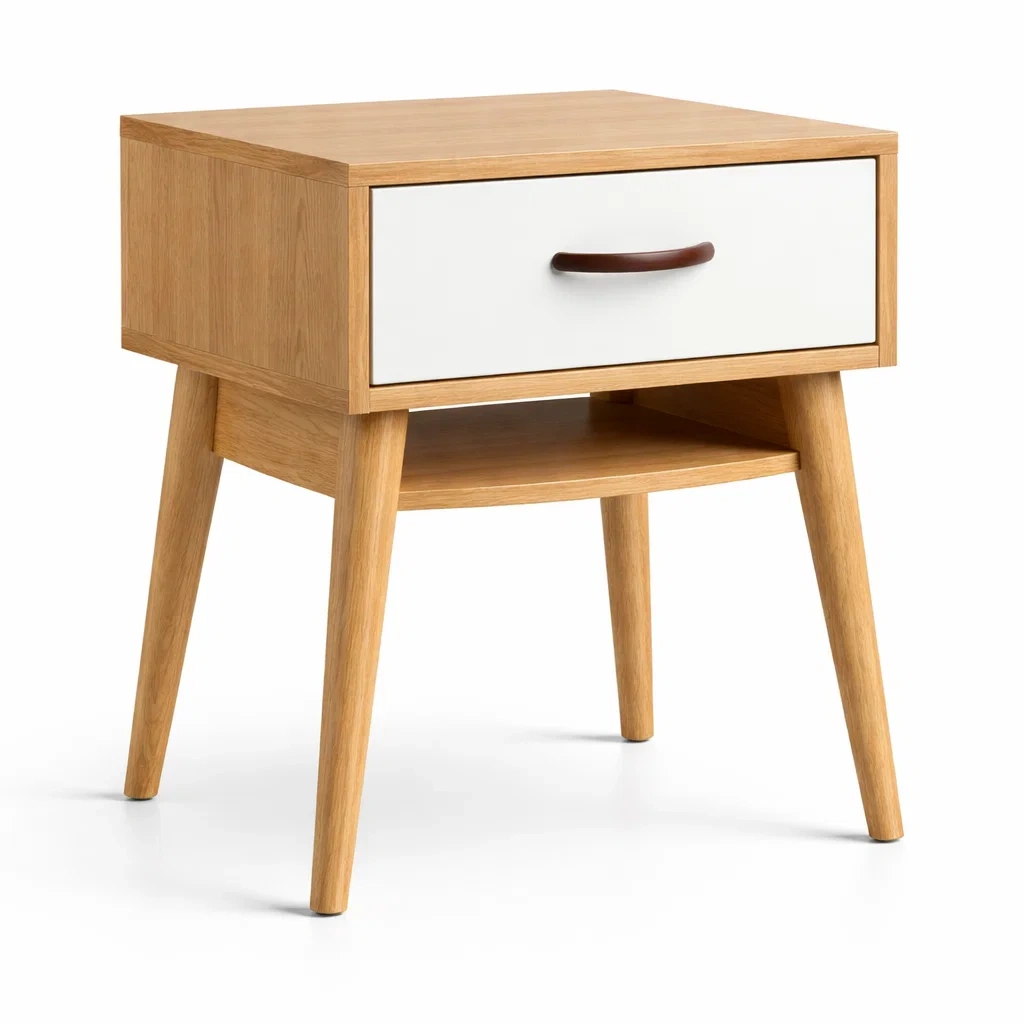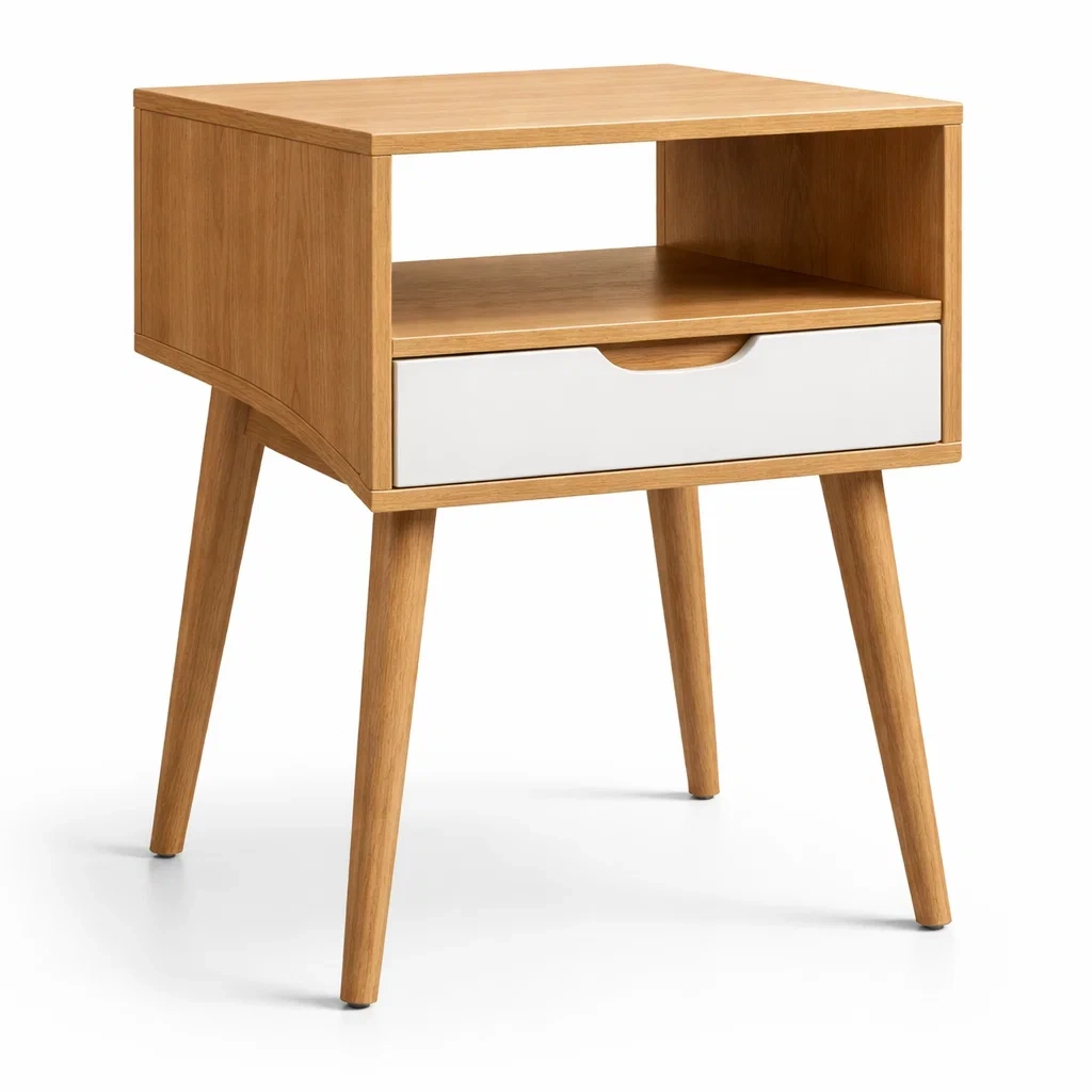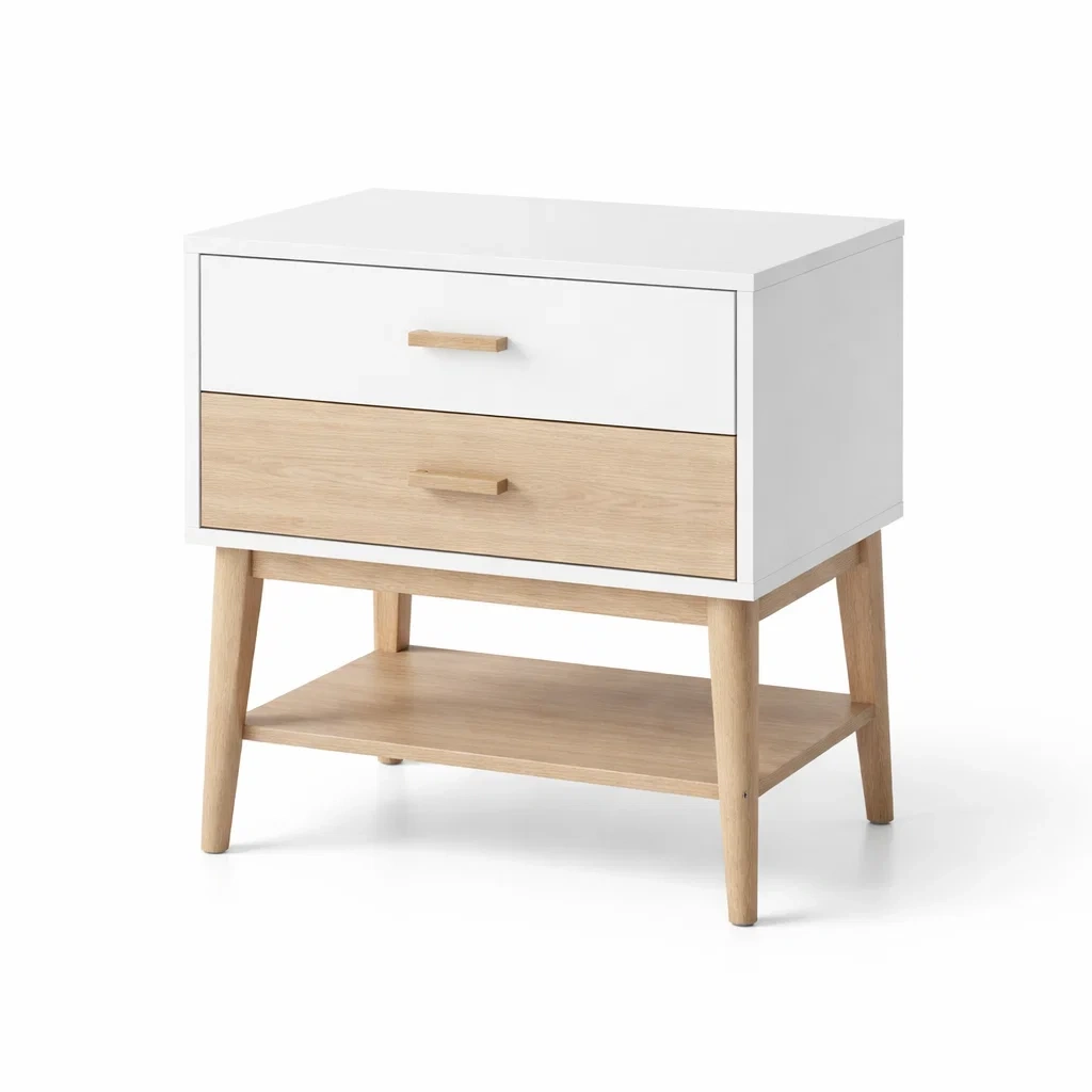 Comodino in mdf e legno bianco e naturale con due cassetti e ripiano