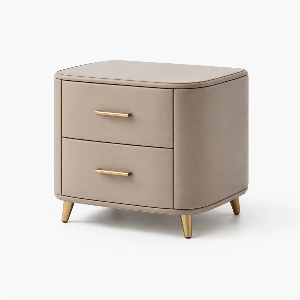 Comodino con due cassetti in pelle sintetica beige e dettagli oro